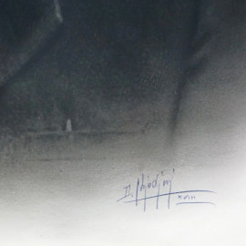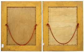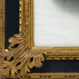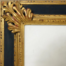 Coppia di cornici in legno intagliato, ebanizzato e dorato, ingombro cm 75x69, luce cm 65x50, (difetti)