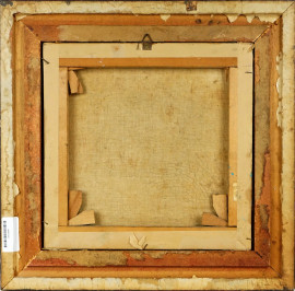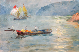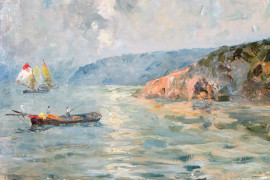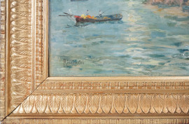 Costa con imbarcazioni, olio su tela, cm 34x34, firmato, entro cornice.