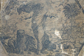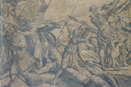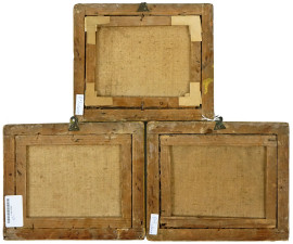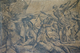 Da Orazio Borgianni (1574-1616), Tre antiche incisioni su carta applicata su tela raffiguranti "Salomè e la Regina di Saba", "La Creazione degli animali" e "David decapita Golia", cm 15,5x19,5, entro cornici, (difetti).