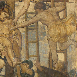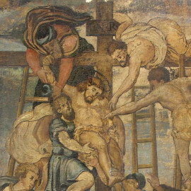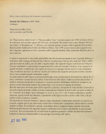 La “Deposizione dalla Croce” o “Discesa dalla Croce” commissionato nel 1545 da Elena Orsini, fu realizzato nel secondo quarto del XVI sec. da Daniele Ricciarelli noto come Daniele Da Volterra detto “il Braghettone”. L’affresco, era originariamente situato nella Cappella Orsini della Basilica della Santissima Trinità dei Monti a Roma. Nel 1798 venne rimosso dal supporto murale originale, applicato su tela e spostato nella Cappella Bonfili della medesima Basilica dove si trova tutt’ora.