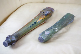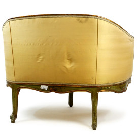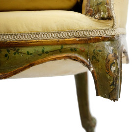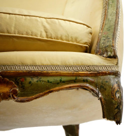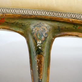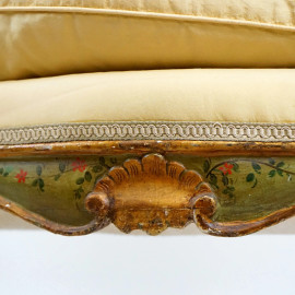 Divano in legno intagliato e laccato, Venezia, XX secolo, rivestito in tappezzeria color beige, gambe mosse, cm h 84x110,5x60, (difetti, gambe rotte).