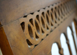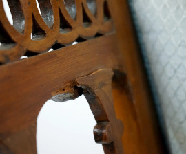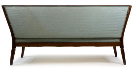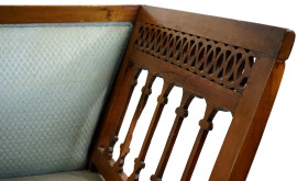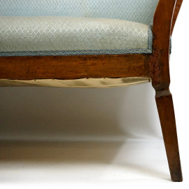Divano in noce, inizi XX secolo, braccioli scolpiti e traforati, gambe troncopiramidali, schienale e seduta rivestiti in tappezzeria celeste, cm h 85,5x189,5x66, (difetti)