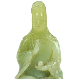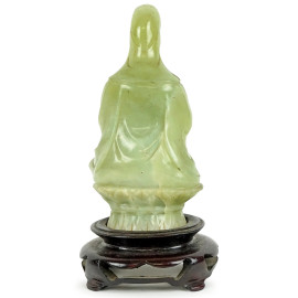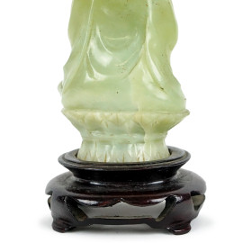 Divinità orientale, scultura in giadeite, poggiante su base in legno, cm h 15, XX secolo.