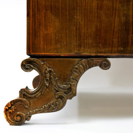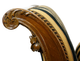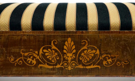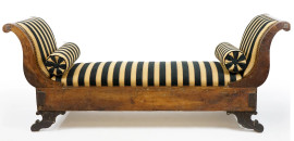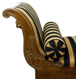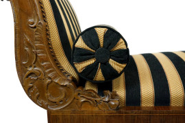 Dormeuse in noce, fine XIX secolo, rivestita in tappezzeria a righe, decori scolpiti ed intagliati, cm h 83x200x60, (difetti).