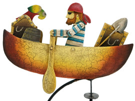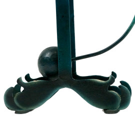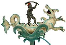 Due giocattoli da tavolo con pendoli in ferro battuto policromo raffiguranti S.Giorgio ed il drago e Marinaio, alt. max cm 49, inizi XX secolo, (segni del tempo).