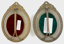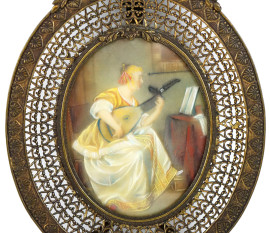 Due miniature dipinte raffiguranti Nobildonna con cane e Suonatrice di liuto, cm 8x6,5, prima metà XX secolo, entro cornici traforate ad assetto ovale.