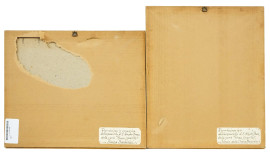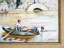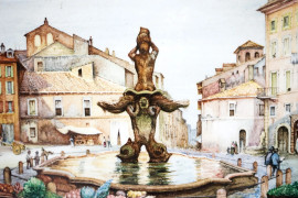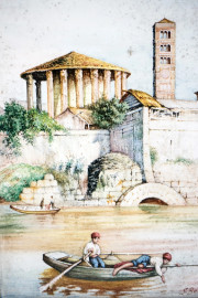 Due placche in ceramica dipinta raffiguranti Sbocco della Cloaca Maxima e Piazza Barberini, misure max cm 12,5x18,5, firmati, entro cornici.