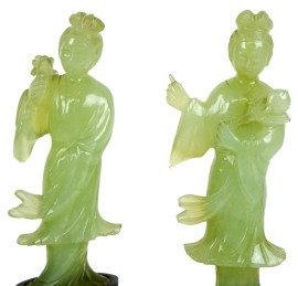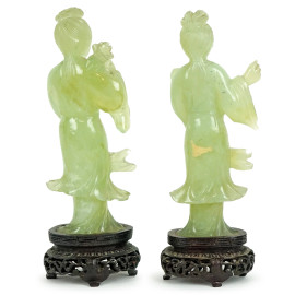 Due sculture in giadeite raffiguranti fanciulle stanti con fiori di loto, basi in legno, alt. cm 18, XX secolo.