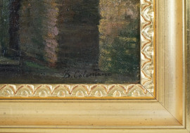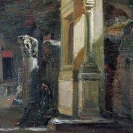 Edicola con figura seduta, olio su tavola, cm 22,5x33,5, circa, firmato B.Celentano, entro cornice.