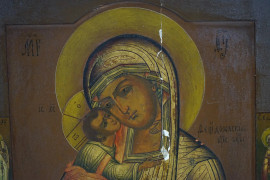 Icona raffigurante Madonna con Bambino e i Santi, tempera su tavola, cm 35,3x30, inizi XX secolo, (difetti e restauri).