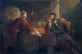 Interno con pontefice e soldato, olio su cartone, cm 20x22, firmato Stefano Ussi, entro cornice.
