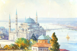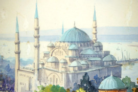 La Moschea Blu, acquarello su carta, cm 30x50, firmato, entro cornice.