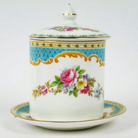 Lotto composto da due zuccheriere con piattino in porcellana policroma, decori a motivi floreali, manifatture diverse, misure max cm h 12, (cucchiaino da restaurare)