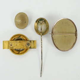 Lotto composto da tre spille ed un cammeo ovale raffiguranti profili di nobildonne e nobiluomo ad altorilievo, materiali ed epoche diverse, lunghezza max cm 8,5, (difetti).