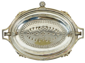 Lotto composto da un vassoio con coperchio ed un portavivande in metallo argentato, misure max cm h 21x31x22,5, metà XX secolo, (segni del tempo).