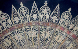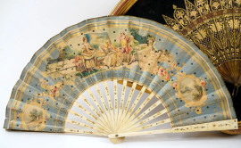 Lotto composto da un ventaglio traforato e dorato entro teca ed uno con scene galanti dipinte su carta in policromia, ingombro max cm 5x31x55, XIX secolo, (difetti).