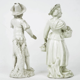 Lotto di due sculture in porcellana bianca raffiguranti donna con cesti di frutta e cavaliere, XIX secolo, altezza max cm 15, (difetti)