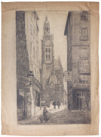 Maestro dei primi del Novecento, Scorcio cittadino, grafite su carta vergellata, cm 28x39, con cornice, provenienza collezione romana