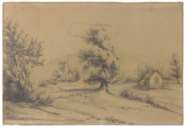 Maestro del XIX secolo, Paesaggio campestre, grafite su carta, cm 26x17, con cornice, provenienza collezione romana.