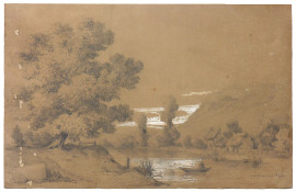 Maestro del XIX secolo, Paesaggio lacustre, grafite e rialzi in biacca su carta, cm 29x19, con cornice, provenienza collezione romana