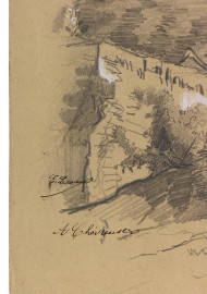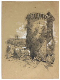 Maestro del XIX secolo, Rovine di torrione, grafite e rialzi di biacca su carta, cm 24x32, firmato in basso a sinistra, con cornice, provenienza collezione romana