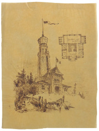 Maestro del XIX secolo, Veduta di castello, inchiostro su carta, cm 20x26, con cornice, provenienza collezione romana.