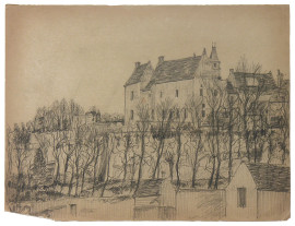 Maestro del XIX secolo, Veduta di paese con alberi, grafite su carta, cm 33x25, con cornice, provenienza collezione romana