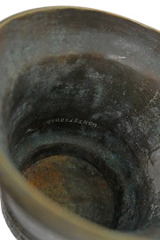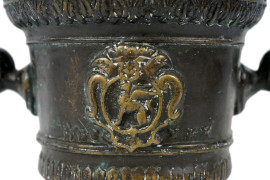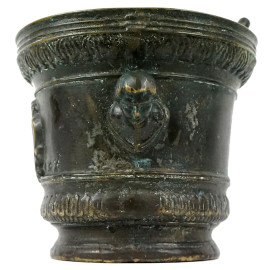Mortaio e pestello in bronzo, decoro con stemma a bassorilievo, doppia presa laterale a foggia di teste di fanciulli, alt. cm 17, diam. cm 19,8, XX secolo, (difetti).