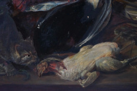 Natura morta con cacciagione, olio su tavola, cm 80,5x120, metà XX secolo, entro cornice, (difetti).