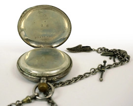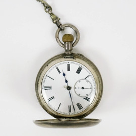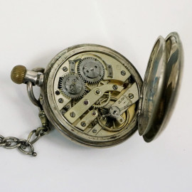 Orologio da tasca in argento con quadrante in porcellana a numeri romani, inizi XX secolo, completo di catenina, (difetti)