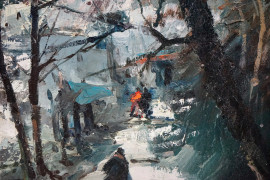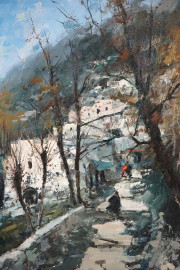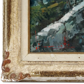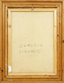 Paesaggio con figure, olio su tela, cm 70x50,5, firmato Claudio Simonetti, entro cornice