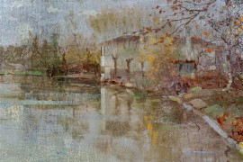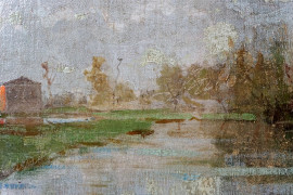 Paesaggio lagunare, olio su cartone, cm 57x30, firmato Vettore Zanetti Zilla, entro cornice.
