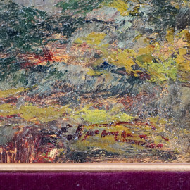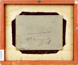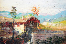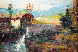 Paesaggio montano con casa, olio su cartone, cm 18x24, firmato, entro cornice.