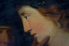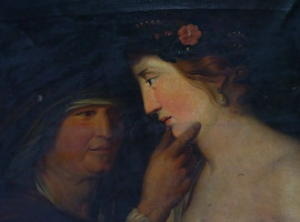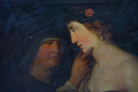 Pittore neoclassico, XIX secolo, Anziana con fanciulla, olio su tela, cm 45x61, entro cornice