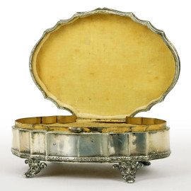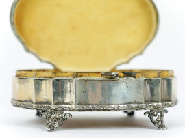 Portagioie in argento, coperchio con decori incisi, poggiante su quattro piedini, cm h 5x13,5,10, XX secolo, (difetti),