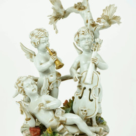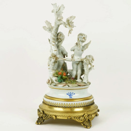 Putti musicanti in porcellana policroma, Capodimonte, XX secolo, base in bronzo dorato, cm h (difetti)