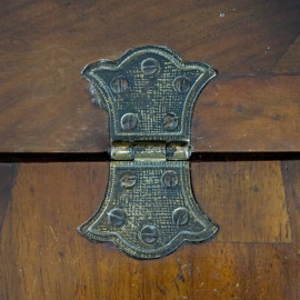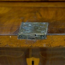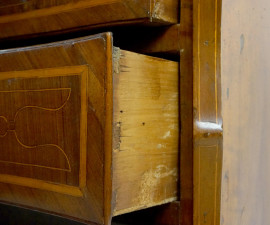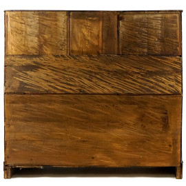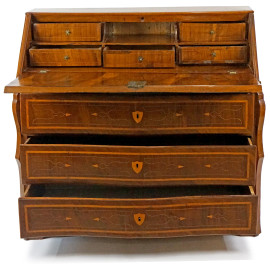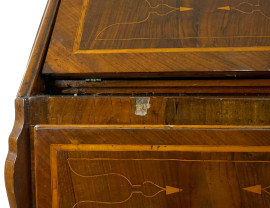 Ribalta in noce filettatata con intarsi in bosso, XIX secolo, di linea mossa, a tre cassetti ed uno sportello a calatoia celante all'interno cinque cassettini e vuoti, cm h 110x119x52, (difetti)