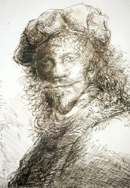 Ritratto di Rembrandt, china su carta, cm 20x18,5, entro cornice, (macchie sulla carta).