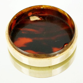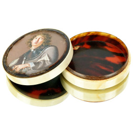 Scatolina con ritratto di cavaliere dipinto ad olio su carta, alt. cm 2, diam. cm 8, inizi XX secolo, (difetti).