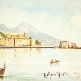 Scorcio del golfo di Napoli, acquarello su carta, cm 8,5x16,5, firmato.
