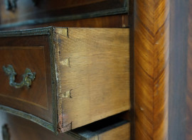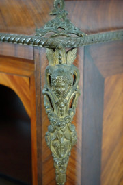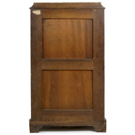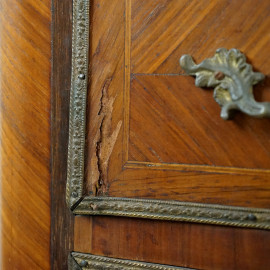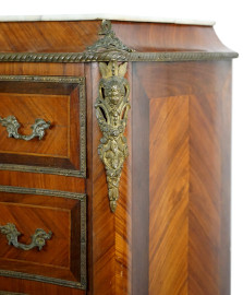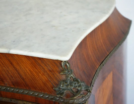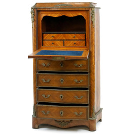 Secrétaire Napoleone III impiallacciato in varie essenze pregiate, fine XIX-inizi XX secolo, piano in marmo bianco, uno sportello a calatoia celante tre cassettini all'interno, parte inferiore a tre cassetti, finiture in bronzo, cm h 121x74x34, (difetti).