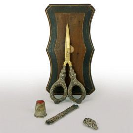 Set da cucito in argento, misure max cm 12x5, inizi XX secolo, entro cofanetto originale in legno, (forbice non pertinente, mancanze)