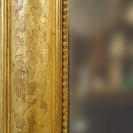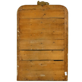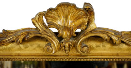Specchiera di linea sagomata, Francia, XIX secolo, in legno dorato con cimasa intagliata a motivi floreali, misure ingombro cm h 131,5x81,5, misure luce cm h 111x61,5, (segni del tempo).
