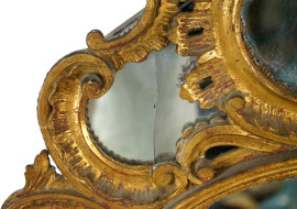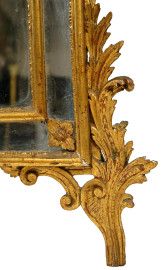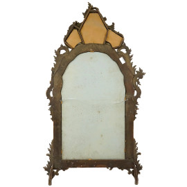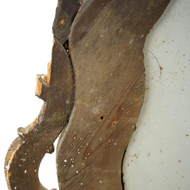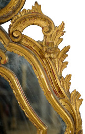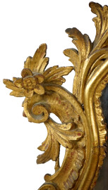 Specchiera in legno intagliato e dorato, inizi XX secolo, a motivi floreali e roccaille, cm 164x96, (difetti)