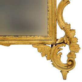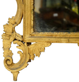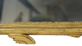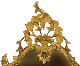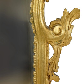 Specchiera in legno intagliato e dorato, inizi XX secolo, cimasa a forma di vaso con fiori ricadenti dalla sommità centinata, cornice a tralci e volute, cm 167,5x77, (difetti e mancanze)