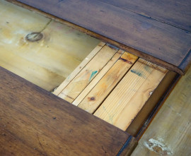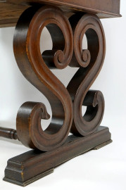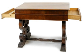 Tavolino in noce, inizi XX secolo, piano di linea rettangolare allungabile, montanti laterali sagomati riuniti da tarversa a rocchetto, cm h 77x99x68, (difetti).