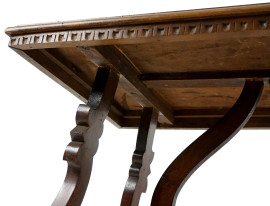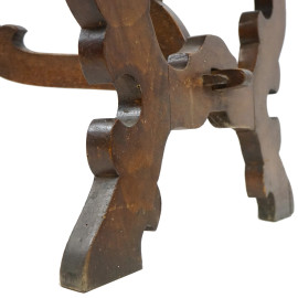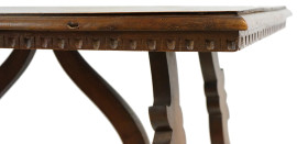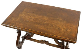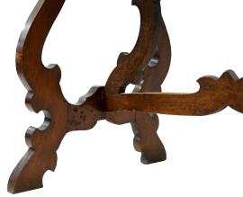 Tavolo frantino in noce, prima metà XX secolo, piano di linea rettangolare, fascia dentellata, montanti sagomati riuniti da traversa, cm 76,5x90x54, (difetti).