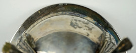 Vaschetta in argento, di linea ovale, bordo a foglie lanceolate, corpo liscio poggiante su quattro piedi con teste femminili desinenti a zampa leonina, inzi XX secolo, cm 6x15,5x12,5, gr. 200