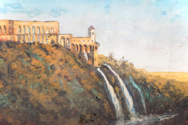 Veduta di Tivoli, olio su tavola, cm 18x31, firmato, entro cornice.
