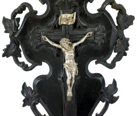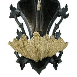 Acquasantiera in ebano intagliato con crocifisso e vasca a foggia di conchiglia, cm 32x18,5, (difetti).